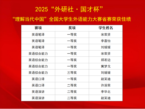 近日,2025年“外研社·国才杯”“理解当代中国”全国大学生外语能力系列大赛省级比赛圆满落幕 久久影视资源,我校外国语学院参赛学生发挥出色,凭借扎实的外语功底与全面的综合素养,在六个赛项中表现优异,共斩获一等奖11项,二等奖5项,三等奖4项,获奖数量与质量均创近三年新高,这一优异成绩,生动诠释了我校学子过硬的外语综合素养与对当代中国发展的深刻洞见。