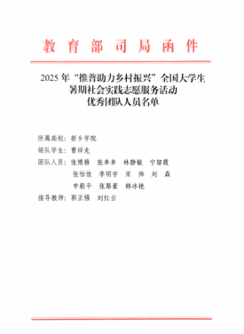 教育科学学院发动师生积极参加,通过师生团队精心制定方案 毛片在线观看,创新设计形式,扎实开展实践活动,取得了显著的成效,由郭正强和刘红云老师指导,张博雅,张单单等11位学生参与的团队荣获2025年“推普助力乡村振兴”全国大学生暑期社会实践志愿服务活动优秀团队。