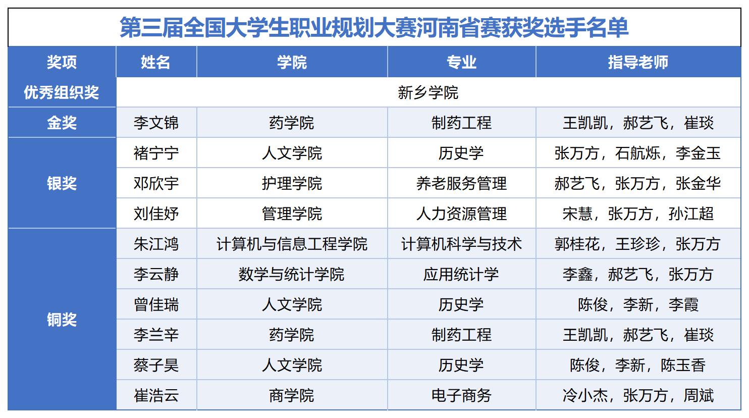 1月28日,第三届全国大学生职业规划大赛河南省决赛落幕,我校学生表现突出 久久影视资源,斩获1金3银6铜,10名参赛选手全员获奖,获奖率达100%,同时,学校获评优秀组织奖,王凯凯,郝艺飞,崔琰三位教师荣获优秀指导教师奖。