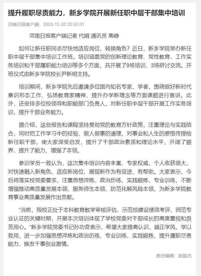 上一条:河南教育宣传网报道我校举办第七届辅导员素质能力大赛 下一条:河南日报顶端新闻报道我校开展新任职中层干部集中培训