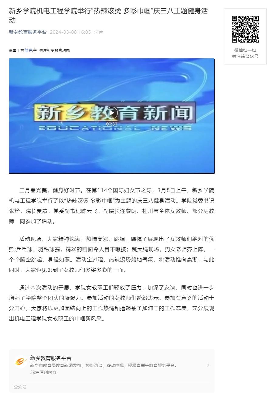 上一条:新乡教育服务平台报道我校机电工程学院开展宿舍消防安全大排查及卫生环境大检查工作 下一条:《河南教育》(高等教育)杂志. 河南教育宣传网(学习强国号)发表我校党委书记孙功奇署名文章《学习贯彻习近平文化思想 践行新时代新的文化使命》 久久高清视频.