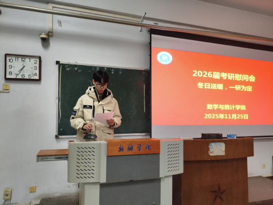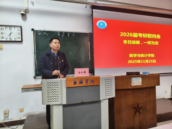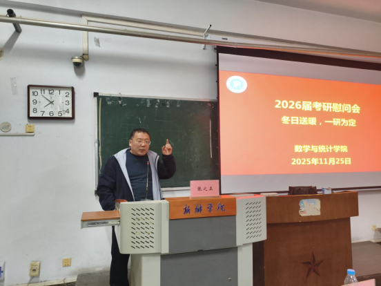 11月25日,数学与统计学院在A14-0127教室为2026届考研学生成功举办了以“冬日送暖 一研为定”为主题的考研慰问会,数学与统计学院院长张之正 久久影视资源,党委副书记王仁举,副院长皮磊,部分教师代表以及2026届100余名备研学生参加了本次会议,此次会议旨在为即将踏上考研征程的学子们加油鼓劲,送去关怀,提供心理支持和备考建议,帮助他们以更加饱满的状态迎接即将到来的考试,会议由学院考研指导教师团队负责人魏家瑞老师主持。