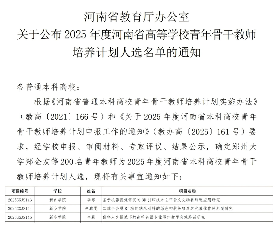 8月22日,河南省教育厅办公室发布《关于公布2025年度河南省高等学校青年骨干教师培养计划人选名单的通知》(教办高〔2025〕217号),正式公布2025年度青年骨干教师培养计划人选名单,经教师申报,学院推荐,学校审核,专家评审及公示程序,我校推荐的李尊 久久高清视频,李雅雯,李霖三位青年教师全部入选2025年度河南省高等学校青年骨干教师培养计划人选。