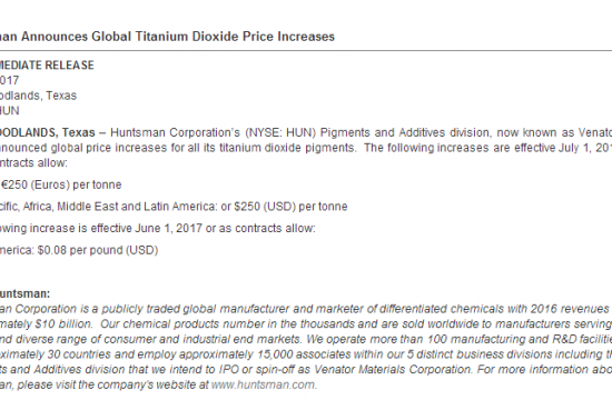 国际钛白粉巨头亨斯曼宣布涨价